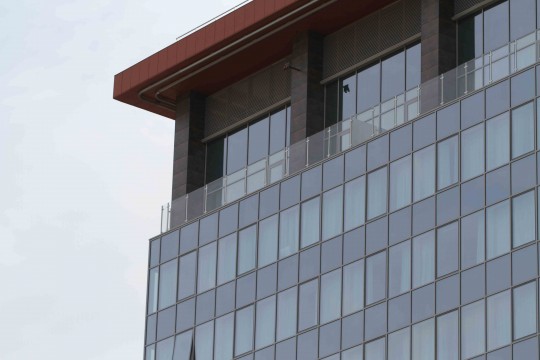 Вторая очередь –остекление основной части здания. Витражная система выполнена в классическом исполнении из профильной системы компании SCHUCO. В витражи встроены скрытые створки с вклеенным стеклопакетом, за счет чего, сами створки не видны на фасаде здания , что позволило сохранить целостность и единую разбивку стеклянных фасадов. В сами створки установлены «умные» датчики кондиционирования, при открытии створки, автоматически выключается кондиционер и наоборот. Угловые решения выполнены в виде алюминиевой угловой крышки , за счет чего витражные конструкции имеют оконченный вид. Для остекления применено мультифункциональное стекло с зеркальным покрытием производства компании GUARDIAN. Утепленные ПВХ рамки и тщательно подобранная формула стеклопакета, позволили выполнить остекление с высоким показателем сопротивления теплопередачи.